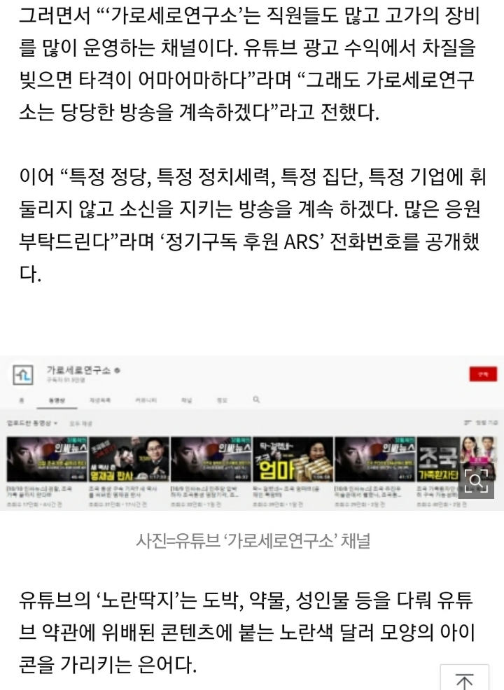 수익 배분율이 7대3이라고 전한 뒤 유튜버들은 슈퍼챗을 위해 더 막말하고 자극적으로 방송하며 극단적 논리에 편승하고 있지만 구글은 슈퍼챗 문제를 방치하고 있다고 비판했다. 주가로세로연구소국민은행 465101-01-273030 예금주. 가로세로연구소 유튜브 채널 분석 보고서 - 플레이보드 가로세로연구소 구독 후원 방법 정기구독 후원 ARS 1877-0665 기업은행 655-026629-01-014 예금주.